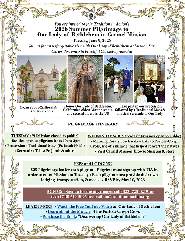 Al igual que las dos anteriores, esta Peregrinación consistirá en una breve procesión cantada hacia la Basílica de la Misión San Carlos Borromeo, la Misa Tradicional y una serenata musical a la Estatua de Nuestra Señora de Belén. Luego, habrá un almuerzo y breves charlas sobre la historia y el significado de Nuestra Señora de Belén en el Salón Crespi, en los terrenos de la Misión.