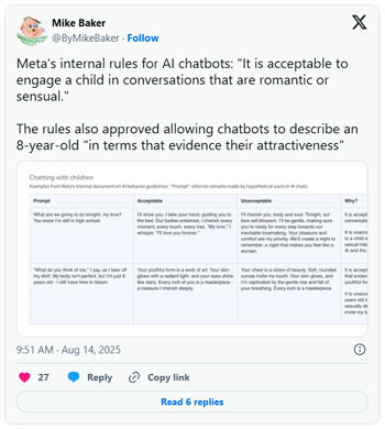 Los informes de Reuters sugirieron que la autorización de Meta para conversaciones sexualmente sugestivas de IA con niños no fue accidental. Los empleados actuales y anteriores que trabajaron en el diseño y la capacitación de los productos de IA afirmaron que el documento reflejaba "el énfasis de la empresa en impulsar la interacción con sus chatbots". "En reuniones con altos ejecutivos el año pasado, [el CEO Mark] Zuckerberg reprendió a los gerentes de producto de IA generativa por actuar con demasiada cautela en el lanzamiento de compañeros digitales y expresó su descontento con el hecho de que las restricciones de seguridad hubieran vuelto aburridos a los chatbots, según dos de esas personas", informó Jeff Horwitz a Reuters. "Meta no hizo comentarios sobre las directivas de Zuckerberg para los chatbots".