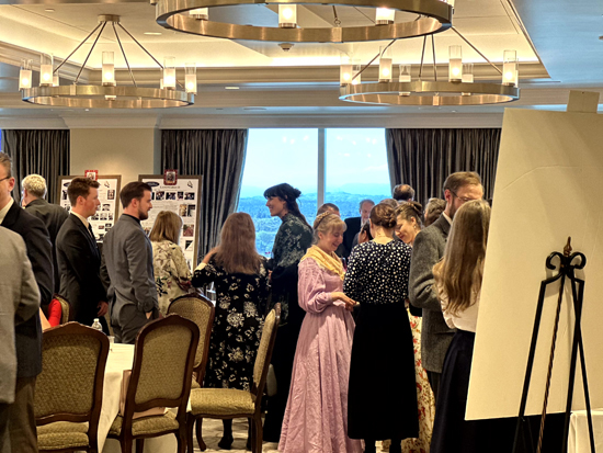 El Sr. John Lane conversa con la Srta. Aanelle Mitchell en una sala llena de invitados