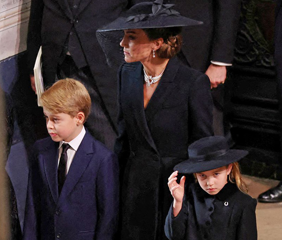 Arriba vemos a la Princesa Charlotte de Gales, vestida apropiadamente con luto negro completo en el funeral de su bisabuela, la Reina Isabel II. En el lado izquierdo de su abrigo luce de manera prominente un broche de herradura con diamantes y perlas, un regalo para la Princesa de parte de la difunta Reina, quien tenía una gran afición por todo lo relacionado con la equitación.El broche perteneció originalmente a la Reina Madre – ver primera fila abajo – quien lo entregó a su hija, la Reina Isabel, antes de su muerte. La Reina, a su vez, se lo dio a su bisnieta, la Princesa Charlotte.