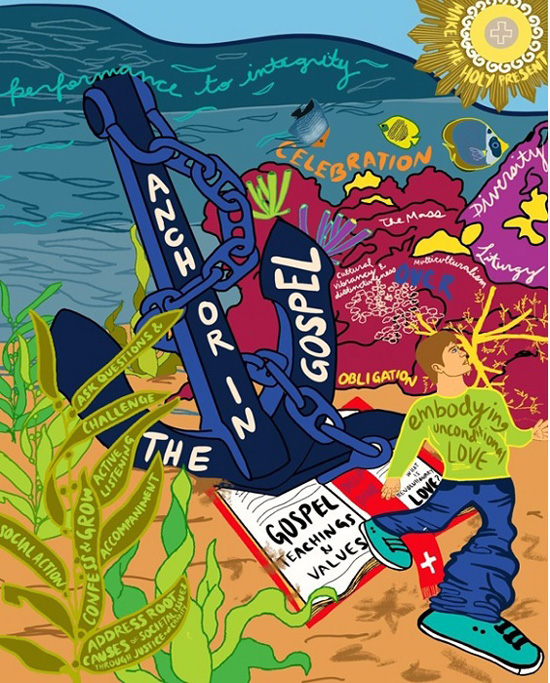 La imagen también incluye algas marinas con siete ramas, las siete posiblemente imitando los siete sacramentos. Los siete sacramentos progresistas parecen ser "confesar y crecer", "hacer preguntas", "desafiar la escucha activa", "acompañamiento", "acción social" y "abordar las causas profundas de los problemas sociales a través de la justicia y la caridad".