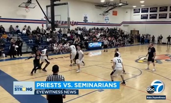 Sacerdotes modernos y seminaristas jugando baloncesto: