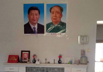 Un altar doméstico exhibe cuidadosamente grandes fotos de Xi y Mao sobre la pequeña cruz y las imágenes religiosas