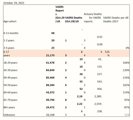 Calculo a partir de los informes del VAERS que las muertes en niños en edad escolar de 6 a 17 años terminarán siendo más de 6 veces las muertes por todas las causas en el año 2017. ¡Esto es un ultraje moral! Las reacciones adversas estarán por encima de 6 millones en los EE. UU. Los efectos a largo plazo son completamente desconocidos, pero nuestros hijos tendrán toda la vida para experimentar los efectos completos.