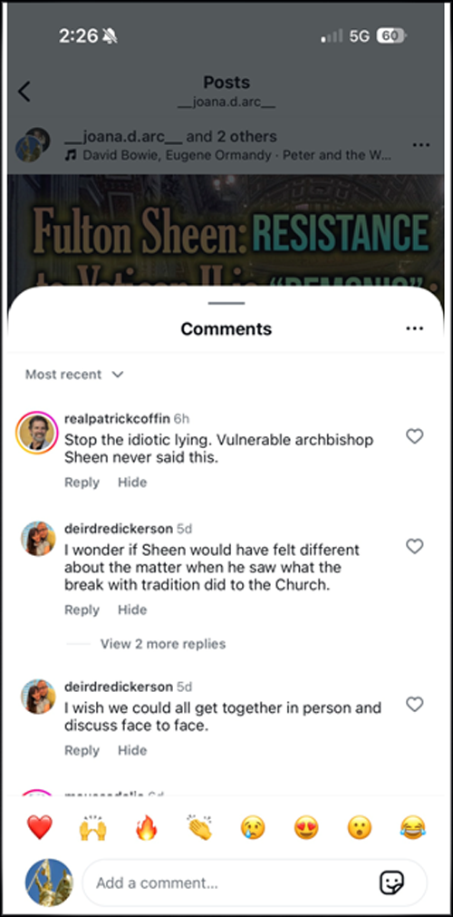 Mientras promovía los artículos de TIA en mi página de Instagram junto con los Caballeros de Elías, una de mis publicaciones recientes sobre Fulton Sheen atrajo mucha atención, al punto de que la popular figura Novus Ordo, Patrick Coffin (ex conductor de Catholic Answers Live), comentó acusándonos de mentir sobre el “vulnerable” (“venerable”?) Fulton Sheen.
