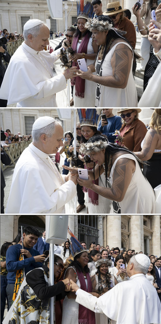 En la primera foto abajo, la mujer indígena le entrega el maracá, que León XIV comienza a sostener. En la segunda, la mujer coloca su mano sobre las del Papa y realiza una especie de “bendición” ritual. La tercera es solo una toma desde atrás; muestra lo pequeña que era la delegación indígena.