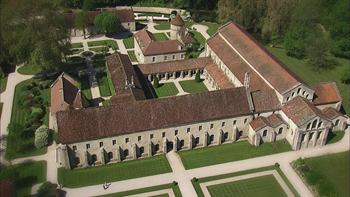 Monasterios medievales: arriba Abadía de Eberbach, un monasterio cisterciense en Alemania; a continuación, la abadía cisterciense de Fontenay en Francia