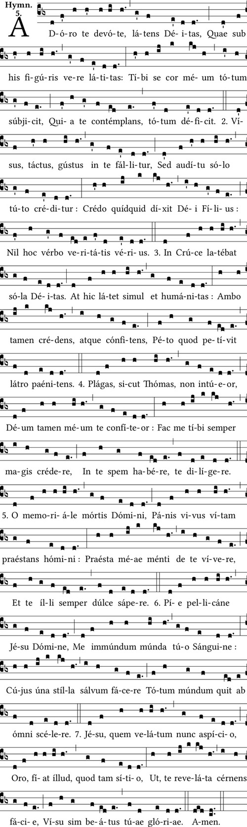 Adoro te devote es aquí interpretado por los Monjes españoles del Monasterio de Santo Domingo de Silos. Nota: en esta grabación solo se cantan los versículos 1, 3 y 7.