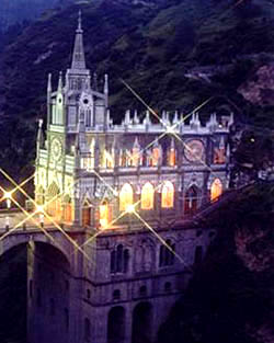 En el siglo XVIII, María Mueses de Quiñones, una mujer indígena de la aldea de Potosí, Colombia, a menudo caminaba seis millas entre su aldea y la vecina Ipiales. Un día, en 1754, mientras hacía el viaje, se acercó al lugar llamado Las Lajas, donde el sendero pasa por un profundo desfiladero del río Guáitara. A María nunca le gustó esta parte del camino. Hubo rumores de que en una cueva en Las Lajas habían apariciones. Tales supersticiones persistieron entre los indios cristianos convertidos. Llevaba a su hija Rosa, niña sordo-muda, en su espalda al estilo indio. Cuando ella había subido a Las Lajas, estaba cansada y se sentó en una roca para descansar. La niña se bajó de su espalda para jugar. Al cabo de un rato, Rosa salió de la cueva y gritó: "¡Mamá, hay una mujer aquí con un niño en sus brazos!" María estaba asustada, ya que era la primera vez que oía hablar a su hija. No vio las figuras de las que hablaba la niña, ni quería hacerlo. Agarró a la niña y se apresuró a ir a Ipiales. Cuando contó lo que había sucedido, nadie la tomó en serio al principio. Sin embargo, a medida que se difundieron las noticias, algunos preguntaron si quizás fuera cierto. Después de todo, la niña ahora podía hablar. Unos días después, la niña Rosa desapareció de su casa. Después de buscar por todas partes, la angustiada María supuso que su hija debía haber ido a la cueva. La niña había dicho a menudo que la Señora la estaba llamando. María corrió a Las Lajas y encontró a su hija frente a una noble dama, jugando con cariño con un niño que había bajado de los brazos de su madre para que la niña disfrutara de su ternura divina. María se arrodilló ante este bello espectáculo; ella había visto a la Santísima Virgen y al Divino Niño. Temerosa de ser ridiculizada, María no dijo nada sobre el episodio. Pero ella y Rosa iban frecuentemente a la cueva para colocar flores silvestres y velas en las grietas de las rocas.